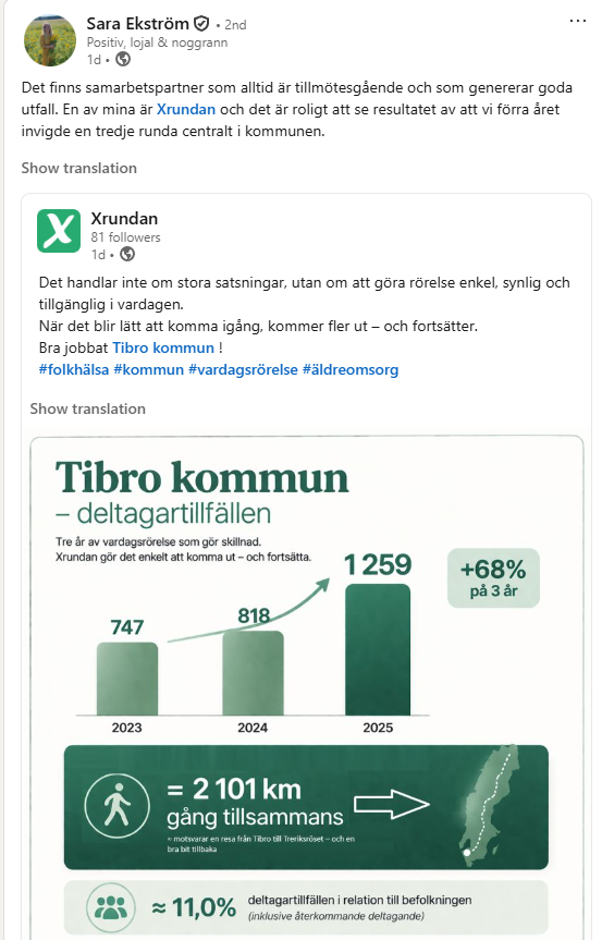 Vi ser ofta samma sak i flera kommuner – när det blir enkelt att komma igång med rörelse, så deltar fler. Och när fler deltar, skapas en vana som håller över tid.